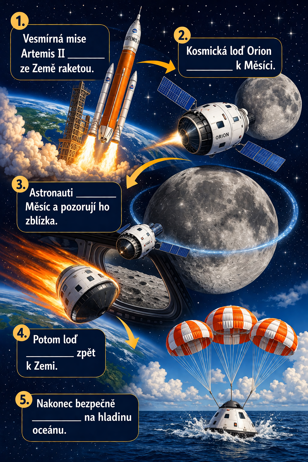 Procvičte se studenty slovesa s prefixy na aktuální téma mise Artemis II: